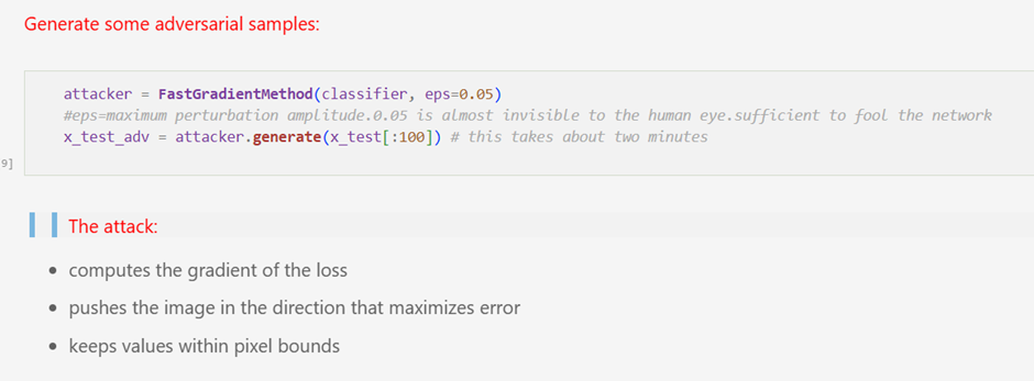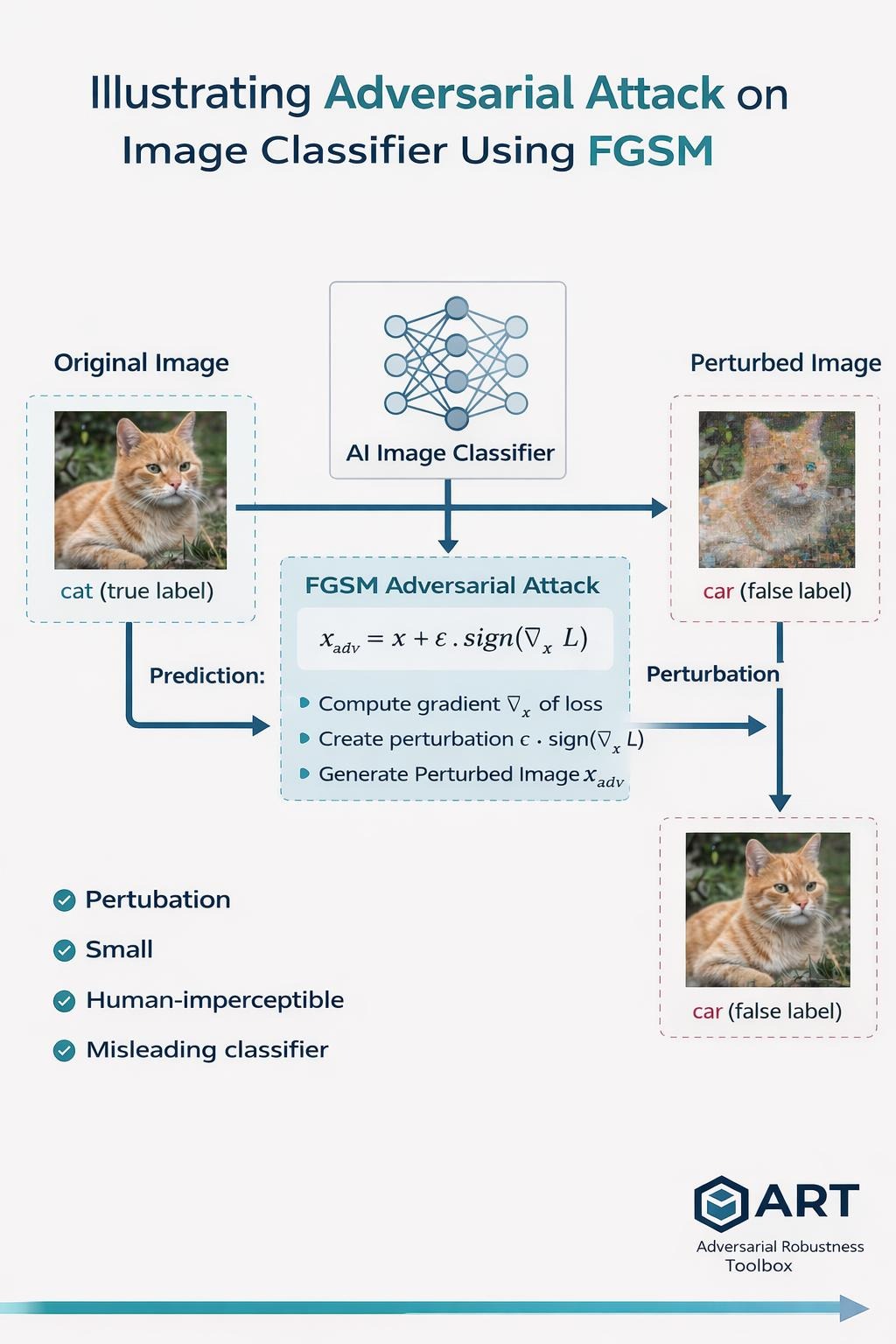 Adversarial examples are generated using the Fast Gradient Sign Method (FGSM), implemented through the Adversarial Robustness Toolbox.